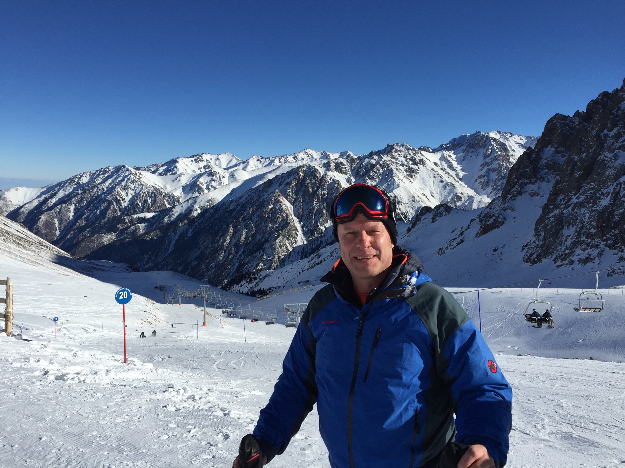 Finally! Ski opening in Shymbulak close to Almaty. It’s a mere 25 min ride from Almaty to the ski resort or less even if you get into the cablecar at Medeo. Unfortunately there wan’t an awful lot of snow, but the snow which I could sample was promising: nice and soft, in the same league as the Rockies’ champaign powder, I would say. The bottom section of the ressort was still closed, so there were only two slopes open on top of the ressort. Too little snow to go offpiste – I got a couple of good scratches on my skis now which illustrate this. That said, it’s a great place to be: season opening day, Saturday, the 29th Nov 2014, was a gorgeous bluebird day at initially -16 Celsius – phantastic views into the mountains and over smoggy Almaty.